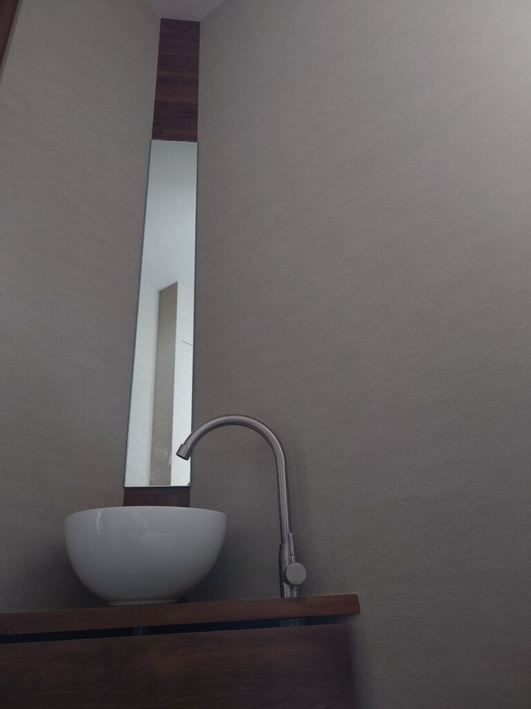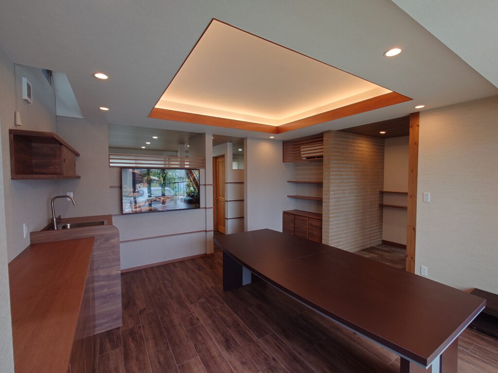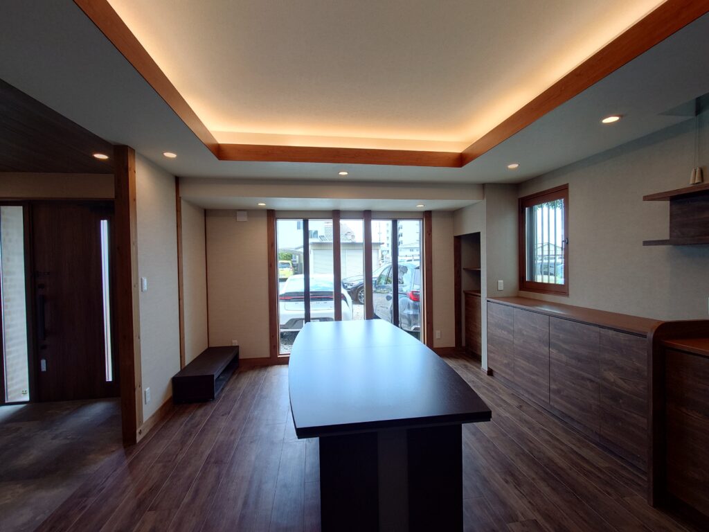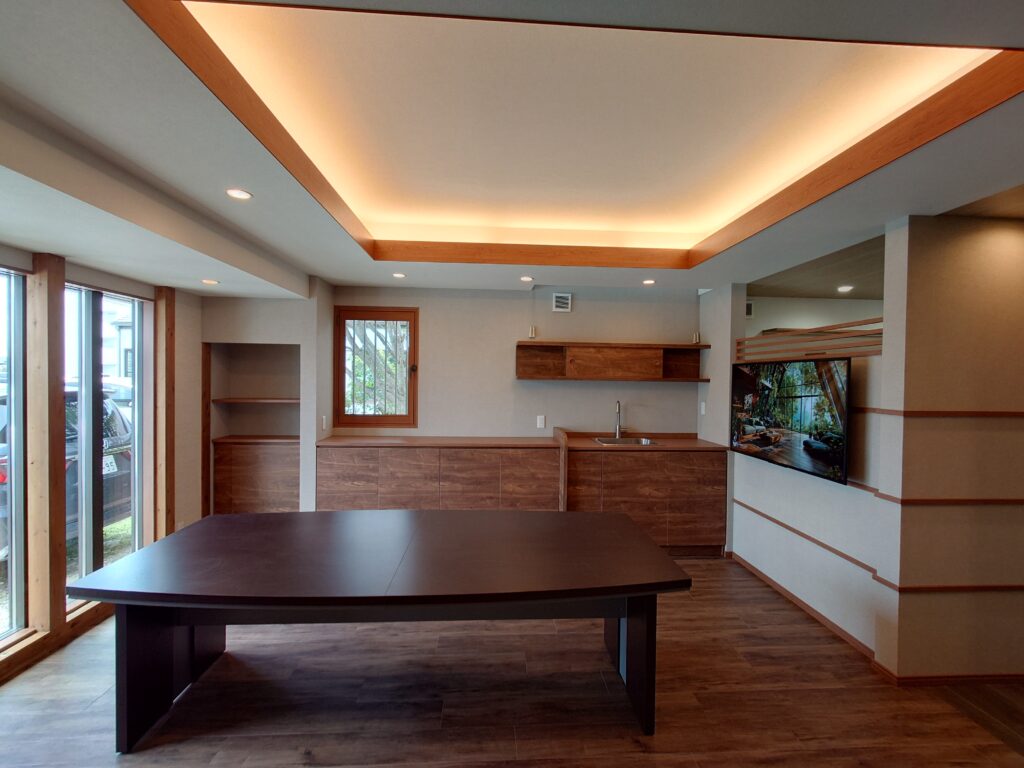 照明はダウンライトと織上げ天井に仕込んだ間接照明のみ、収納家具も全て作り付けとし、全体的にシンプルな造作としてあります。