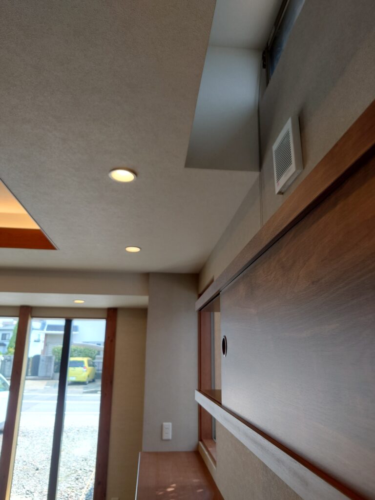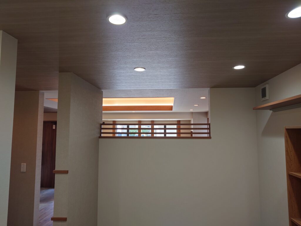 カウンター上部は、既設排煙窓をそのまま使用するため天井を欠き込んであります。