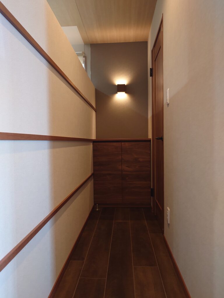 正面の壁仕上げを外部ポーチ袖壁と同じタイル貼りとし、シンプルながら重厚感のある玄関に仕上げました。