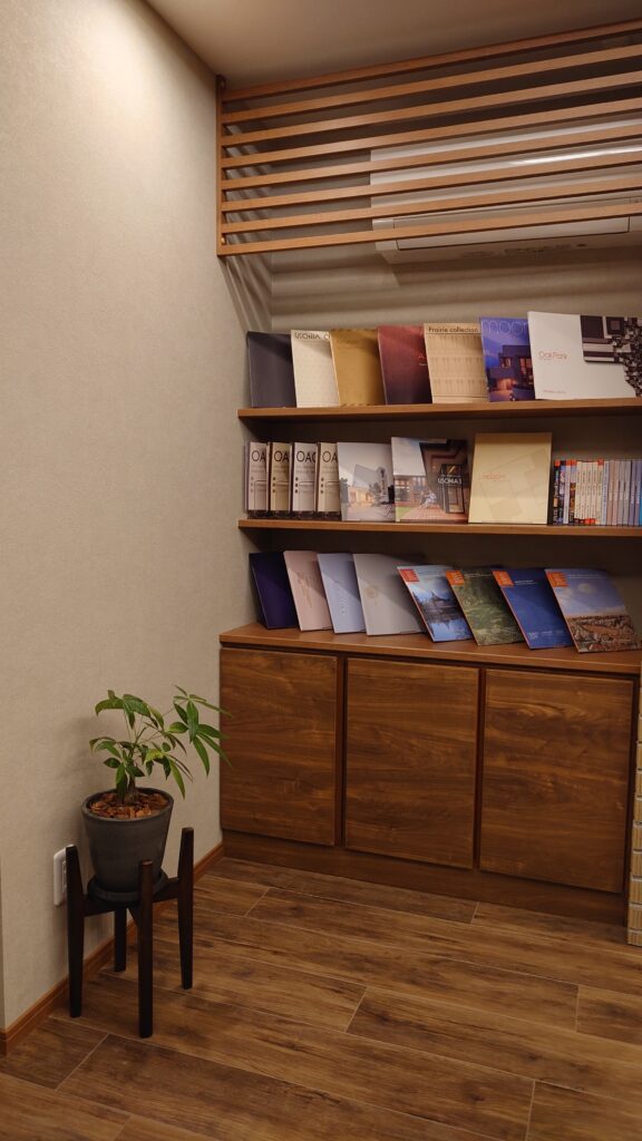 床仕上げを外部ポーチと同系色のビニル床タイルとし、打合室の部分で柄を切り替えています。