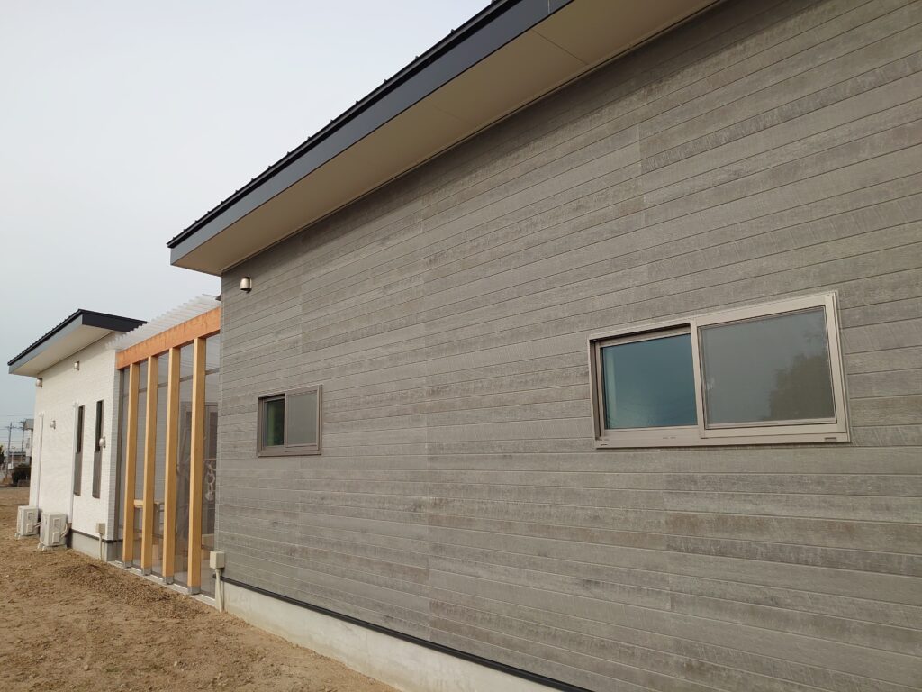 建物は用途の違う3つのブロックに分かれており、両端は屋根はガルバリウム鋼板・外壁を色違いのサイディングで仕上げてあります。