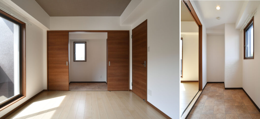 玄関脇には洋室からも使用できる広々とした土間を配し、2室から使えるウォークインクローゼットや